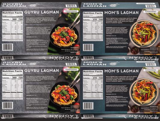 Tomposhki, Fully Cooked Halal Assortment of Guyru & Mom's Lagman - Central-Asian Inspired Unique & Authentic Flavors of Beef with Asian Vegetables & Noodles, 17.6oz/500g, Pack of 4 (2 of Each)